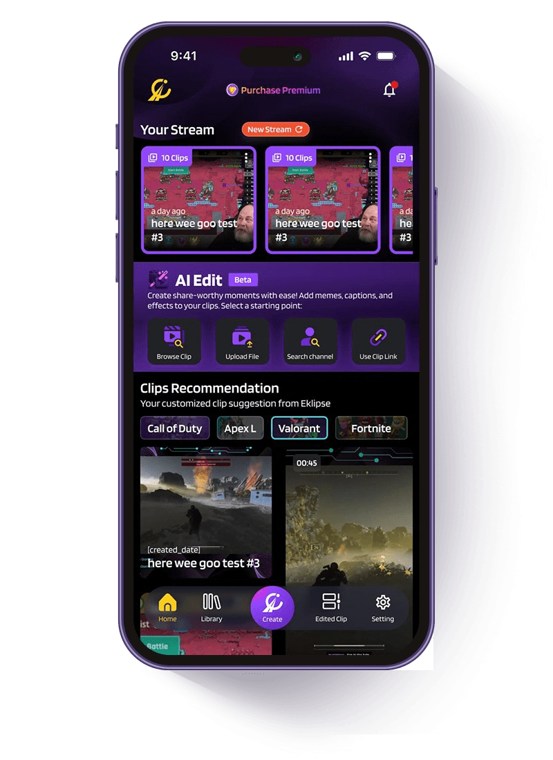 To create clips from your Twitch streams on the Eklipse mobile app, connect your Twitch account and pick your stream. The AI auto clip maker quickly spots your best plays and turns them into polished highlights. You can fine-tune or regenerate clips and format them instantly for TikTok, Reels, or Shorts.